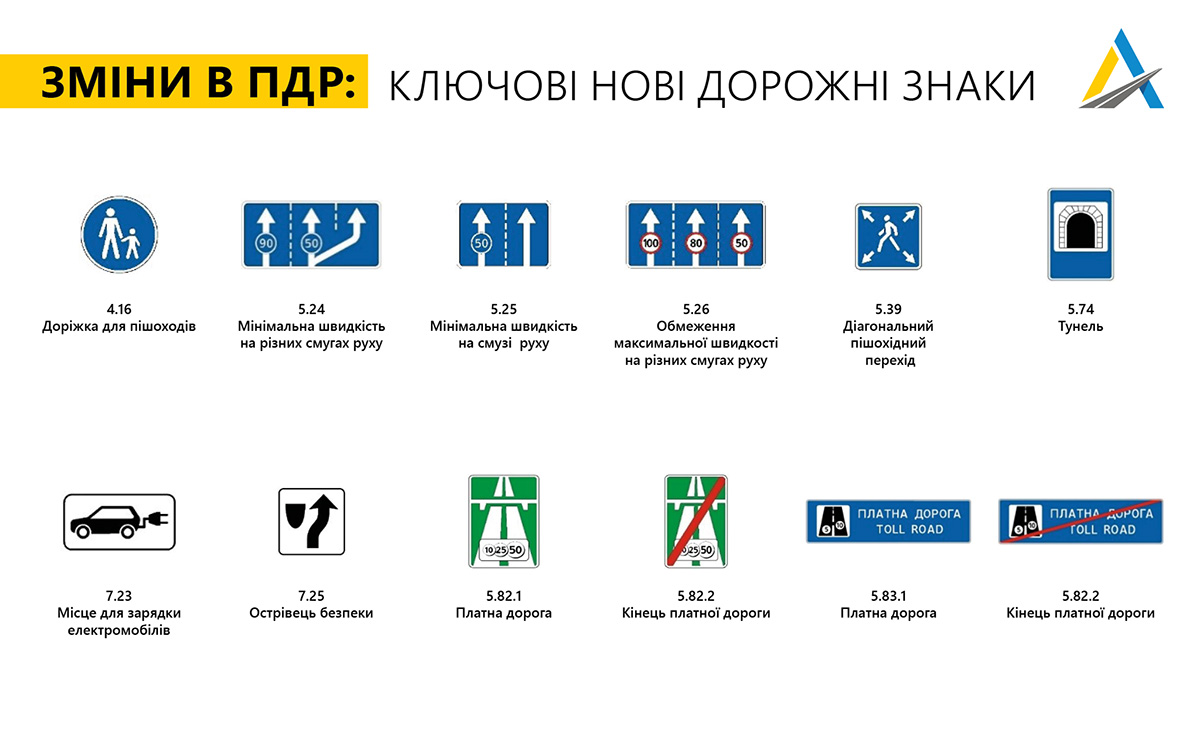 Дорожні знаки: острівець безпеки, початок та кінець платної дороги, пішохідна доріжка, суміжні переходи та ділянки доріг для пішоходів, велосипедів та машин, зони габаритно-вагового контролю, електрозаправні станції тощо.