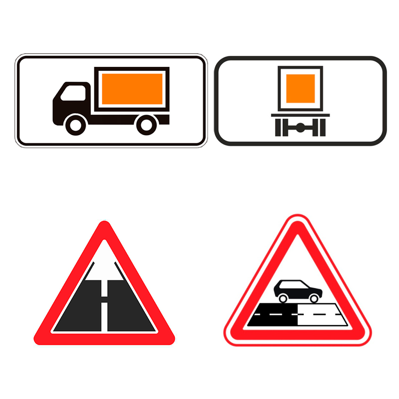 Зміни також зачепили й знаки, які уточнювали вид транспортного знаку «З небезпечним вантажем» (пункт 7.5.8 класифікації дорожніх знаків). Раніше вантажівку на знакові зображували в профіль, а нині – ззаду з прямокутником оранжевого кольору на борту.